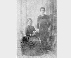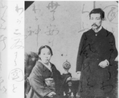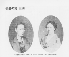 1872年伝道の地 三田 神戸から北北東30キロの奥地にある三田の地とキリスト教とのつながりは、1872年、避暑地有馬でのデーヴィスと三田藩主九鬼隆義との出会いにはじまる。三田は小藩ながら、早くより洋装断髪を施行し西洋風の生活を取り入れ、英学を推進、福沢諭吉をブレーンにもつなど、近代に対する感受性において著しいものがあった。三田藩士の過半は新時代の到来と共に神戸に出て宇治野村英学校、神戸女学院、神戸教会創立の人脈をなした。一般に明治期のキリスト教の源流として植村正久らを擁し日本最初のプロテスタント教会を創立した横浜、海老名弾正ら同志社系列につらなる流れを生んだ熊本、クラークの薫陶を受けた内村鑑三を擁する札幌が挙げられ、キリスト教受容やその後の思想的展開、人脈などに興味深い相違がみられる。しかし、多くは幕藩体制が崩れた中で志の得られない佐幕派青年士族層が中心であり、そのうつうつとした熱情を思うとき、三田士族のからりとした明るい闊達さ、合理性、時代に対する鋭敏な対応などは特筆に価する。それは神戸教会の性格規定の根幹のひとつをなした。(写真:三田藩最後の藩主九鬼隆義と伴侶園子。1888年4月24日原田助より受洗。しかし、入信には三田内部での反対が強かった。) |