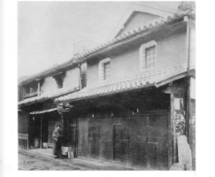 1874年神戸教会の創立 1873年、切支丹禁制令が解かれ、本来の伝道活動が可能となった宣教師たちは、まず繁華街である元町通にキリスト教の書店をひらいた。そしてその建物の半分を礼拝堂として整えた。礼拝に出席した村上俊吉は「僕は風琴の音も讃美歌も此時が始めてで塵外仙境に入つた心地がした」と印象を述べている。礼拝とともに聖書研究会や祈祷会ももたれた。さらに神を信じる者同士の交わりの場として、教会設立が希求された。時は満ち、翌74年4月19日グリーンより11名が受洗、感銘のうちに「摂津第一公会」を創立。デーヴィスは「この日から愛が新しい意味をもった」と奨励をなした。また、松山高吉が200名におよぶ聴衆を前に洗礼の説明、信条の朗読をおこない、前田泰一が聖餐式に先立つ奨めをなすなど、青年たちが礼拝の主要部分を担当、教会形成において日本人信徒のきわだつ主体性を示した。(元町講義所。前に立つ人物は前田泰一といわれている。) |