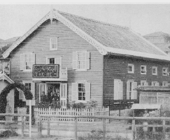 1878年新しい会堂 神戸教会も、当初は宣教師依存の状態がつづいた。しかし、会員相互が力を出し合って経済負担をするという「自給教会」の形成を目指し、自分たちの会堂建築への希望を持っていた。1876年より準備に着手し、ミッション(宣教団)の補助をあおがない方針で募金につとめた。ついに78年11月、北長狭通(きたながさどおり)6丁目にアメリカ開拓期様式の新会堂を竣工した。(写真は新しく建てられた神戸教会堂。「CHURCH KOBE 第一公会」の看板が掲げられている。) |