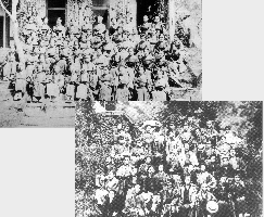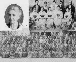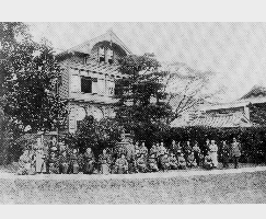 1889年ハウと頌栄 頌栄保育学院は1989年、創立100周年をむかえた。神戸教会と頌栄はその誕生から現代に至るまで緊密な関係を有する。神戸教会の婦人会を中心とする「神戸婦人会」のはたらきが頌栄創立の道そなえをしたことはすでに述べたが、同会は1887年、指導者としてシカゴ幼稚園園長であり保育と音楽の専門家ハウを招き、89年幼稚園、保母伝習所を開園した。1903年米国婦人伝道会に経営を移管するまで物心両面の援助をつづけた。ハウは日本における幼稚園教育のパイオニアとして、またフレーベル主義の伝達者として多くの教材を紹介、著作を残した。そのきわだつ美しさと個性は接する人々に深い刻印を与えつつ、有能な人材を各地の幼稚園に送り出した。(写真右:大正期の頌栄幼稚園。世界各国の旗が飾られ国際性を養った。) |